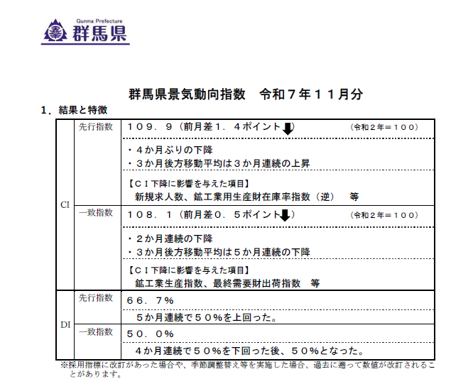 群馬県景気動向指数 令和7年11月分−令和8年2月5日公表