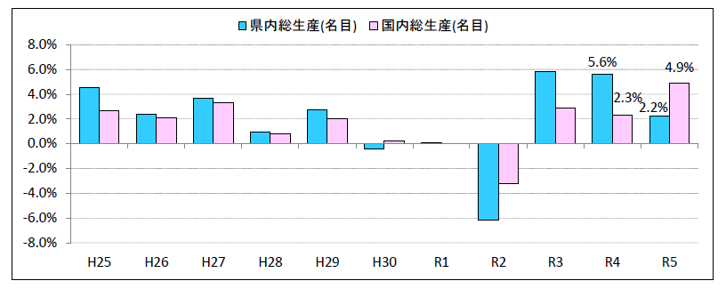 令和5 年度の名目県内総生産は前年度比2.2%増、実質県内総生産(平成27暦年連鎖価格)は前年度比0.7%減で、名目は3 年連続の増加となったが、実質は3 年ぶりの減少となった。
