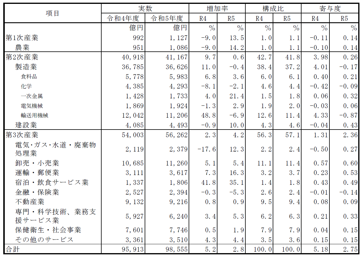 本県の基幹産業である製造業では、主力の輸送用機械製造業が大幅に減少したほか、化学工業なども減少し、一次金属製造業など増加した産業もあったものの、製造業全体で減少となった。一方、非製造業では、宿泊・飲食サービス業が大きく伸びたほか、卸売・小売業や運輸・郵便業なども増加した。この結果、県内総生産の伸びはプラスを維持し、3 年連続の増加となった。しかし、その伸びは2 %を僅かに超える程度で、令和3 年度及び4 年度を大きく下回るものとなった。