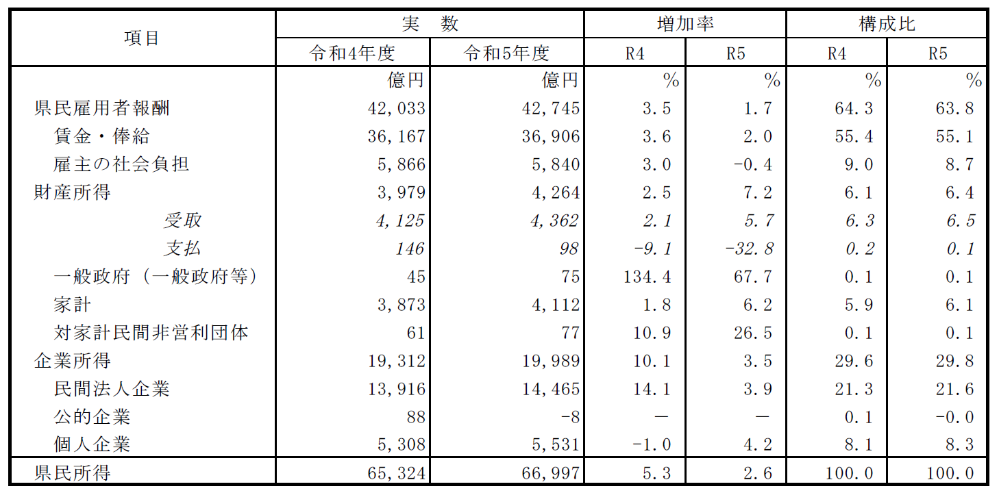 県内総生産の伸びの鈍化を受けて、民間法人企業所得が伸び悩んだことから、県民所得全体の伸びは抑えられ、3 年連続の増加とはいえ、令和3 年度及び4 年度を大きく下回る増加率となった。これにより、1 人当たり県民所得も、低い伸びとなった。