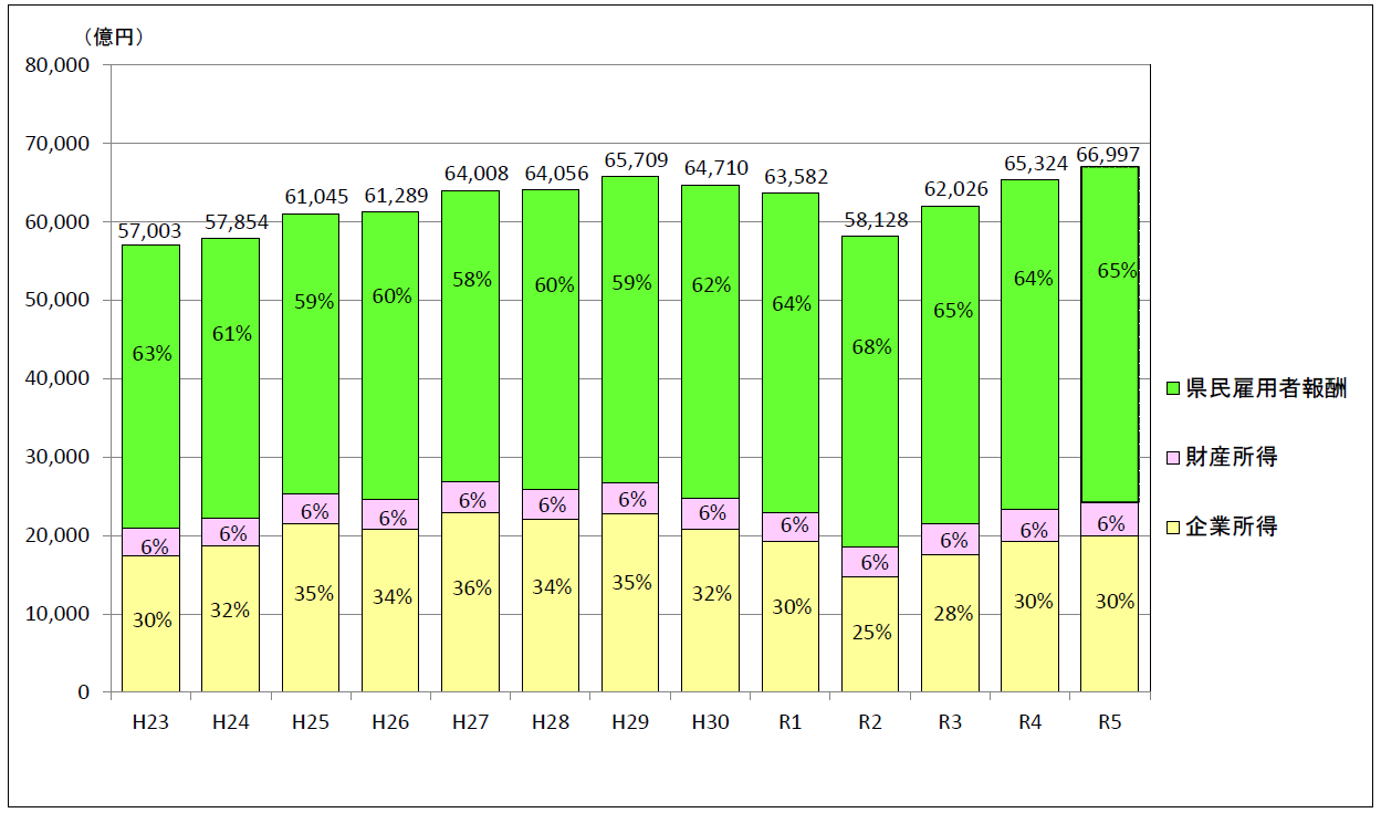 県民所得(分配)は第4 表のとおり、6 兆6997 億円で2.6%増と3 年連続で増加した。