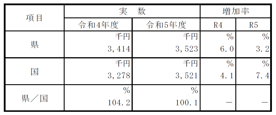 また、県民所得は前年度比2.6%増で3 年連続の増加となり、これを令和5 年10 月1 日現在の総人口で除した1人当たり県民所得は前年度比3.2%増で、前年度から10 万9 千円増加し、352 万3 千円となった。