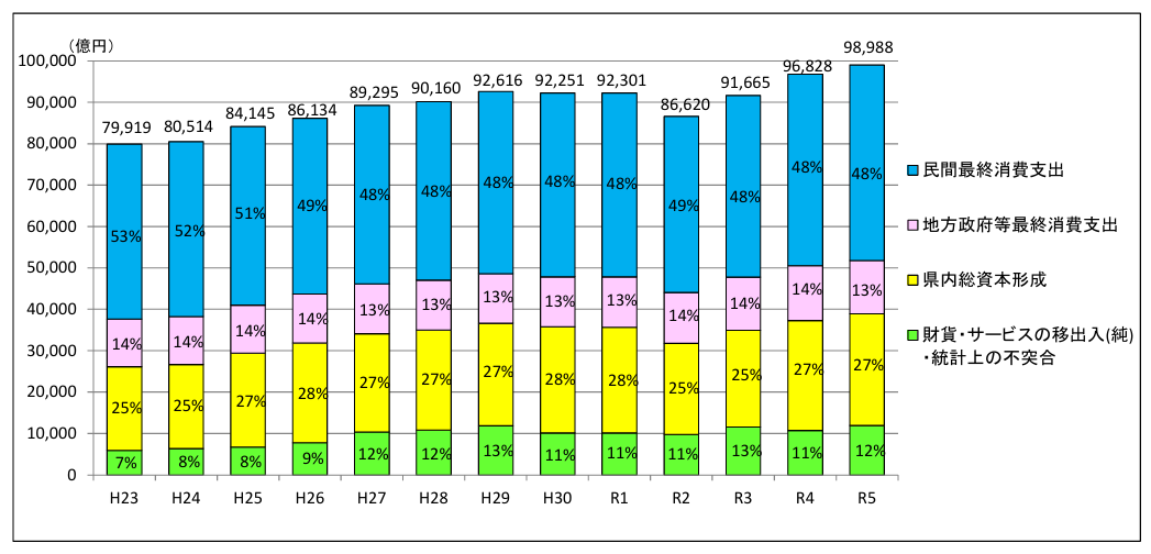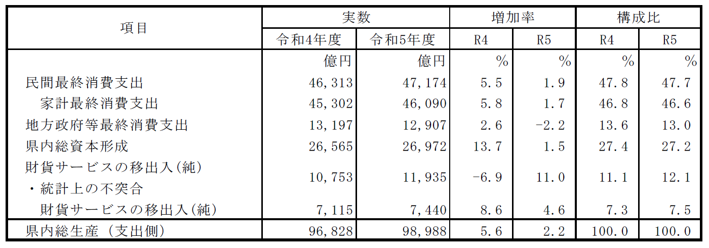 県内総生産を支出側からみると、家計最終消費支出や県内総資本形成などの項目で、伸びが大きく鈍化した。